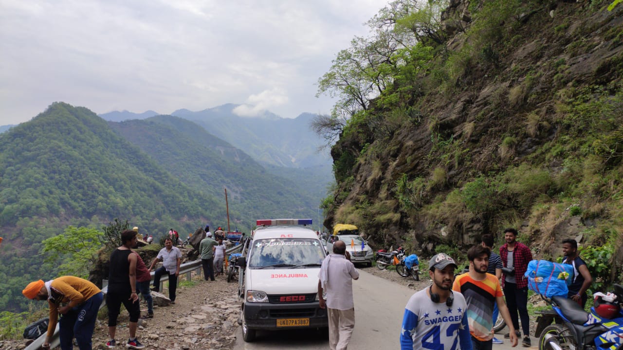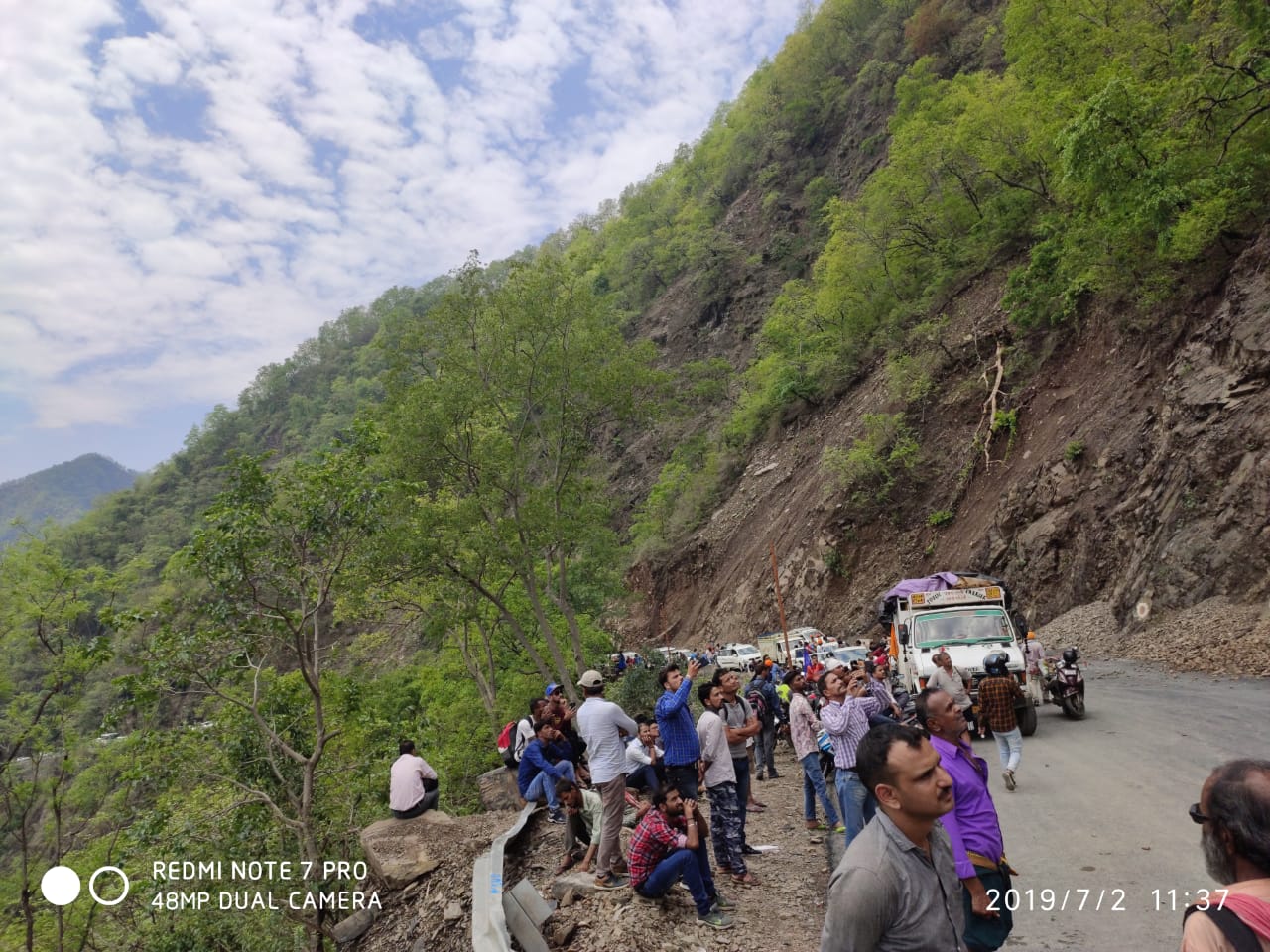 भारी भूस्खलन से लगा कई किलोमीटर का जाम फंसी कई गाड़ियां।