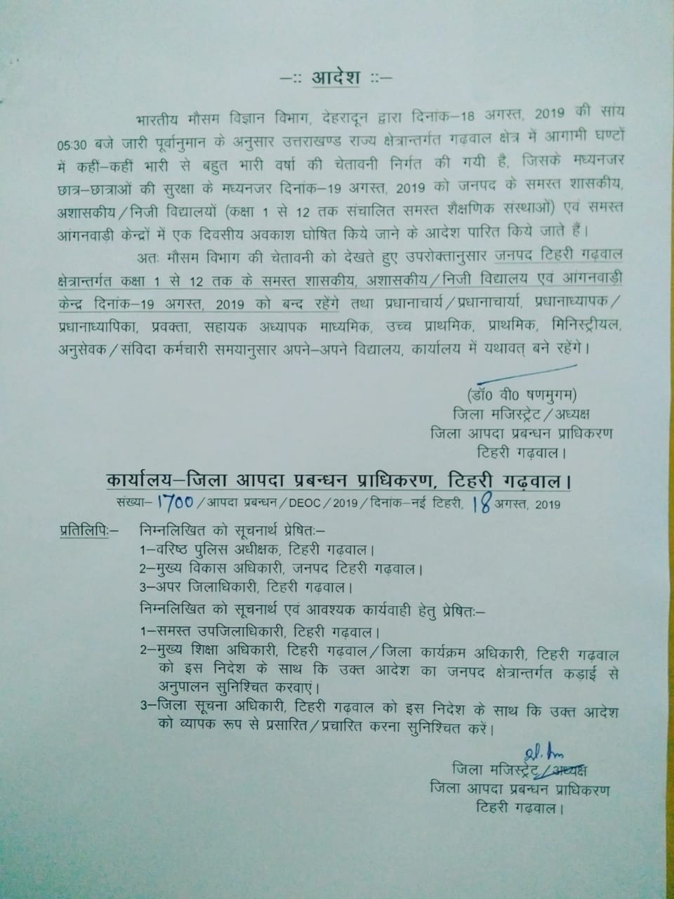 टिहरी जिलाधिकारी वी षणमुगम ने कल का अवकाश किया घोषित