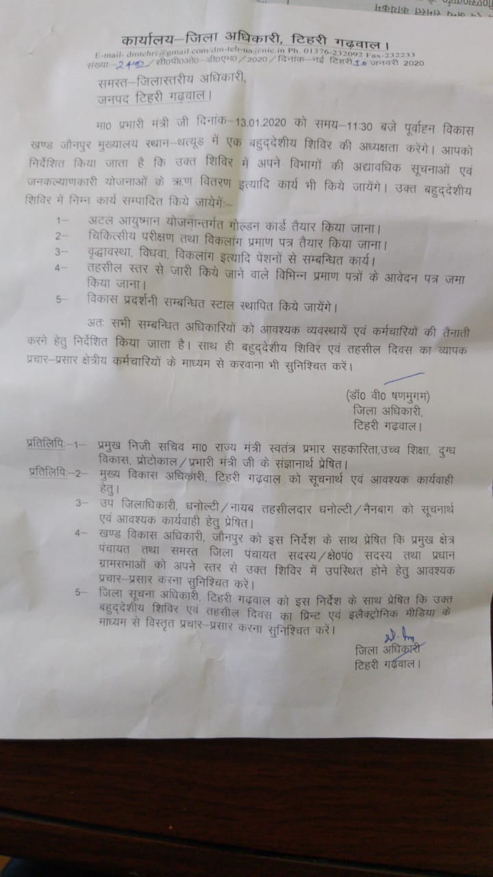थत्यूड। ब्लॉक मुख्यालय थत्यूड में ब्लाक सभागार में बहुउद्देशीय शिविर का आयोजन किया जा रहा है जिसकी अध्यक्षता उच्च शिक्षा एवं सहकारिता मंत्री स्वतंत्र प्रभार डॉक्टर धन सिंह रावत करेंगे बहुउद्देशीय शिविर का आयोजन 11:30 बजे से प्रारंभ होगा जिसमें सभी विभागों के जिला स्तरीय अधिकारी उपस्थित रहेंगे शिविर में 1-अटल आयुष्मान के गोल्डन कार्ड तैयार किया जाना 2-चिकित्सा प्रशिक्षण एवं विकलांग प्रमाण पत्र किया जाना 3-वृद्धावस्था विधवा विकलांग पेंशन संबंधी कार्य व फार्म भरे जाएंगे