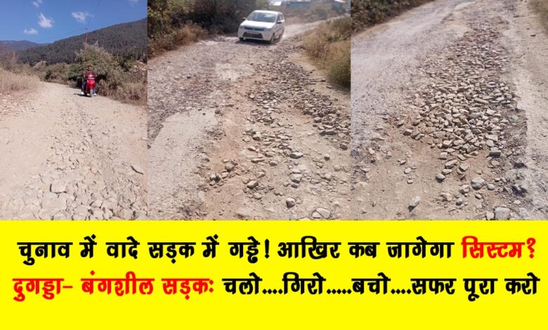 थत्यूड (टिहरी)। दुगड्डा–बंगशील मोटर मार्ग की हालत ऐसी हो चुकी है कि सड़क कम और गड्ढों की बारात ज़्यादा लगती है। पांच किलोमीटर का सफर मानो पांच घंटे की परीक्षा—कभी बाइक फिसल जाए, कभी कार के पहिये गड्ढों में गायब हो जाएं।