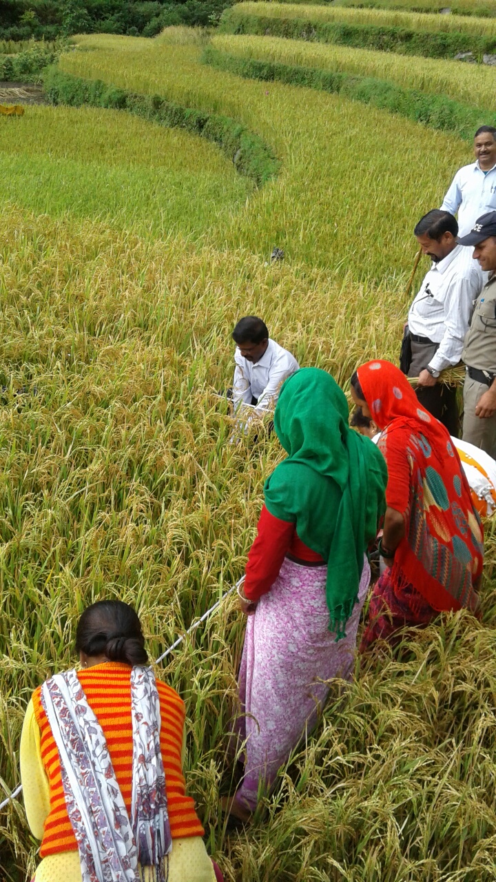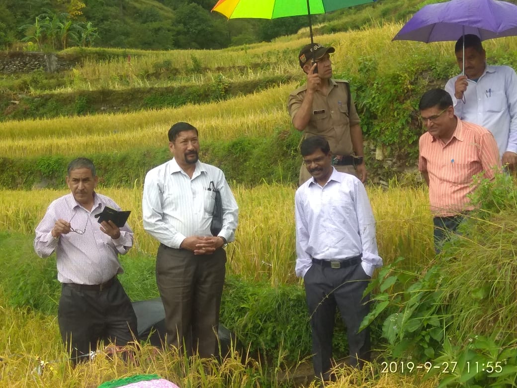 थत्यूड़ : नई टिहरी जिलाधिकारी डाॅ वी0 षणमुगम ने तहसील टिहरी क्षेत्रांतर्गत दिखोलगांव पंहुचकर धान की फसल पर क्राॅप कटिंग प्रयोग का निरीक्षण किया। क्राॅप कटिंग प्रयोग से फसल के औसत उपज का अनुमान लगाया जाता है इसी के तहीत गांव में धान की फसल के दो खेतो में 30 वर्ग मीटर दो प्लाॅट बनाये गये जिसमें धान की कटाई एवं छडान के उपरान्त क्रमषः 23.800 किग्रा0 एवं 18.100 किग्रा0 धान प्राप्त हुआ। इसके उपरान्त 30 वर्ग मीटर में प्राप्त उपज को प्रधानमंत्री फसल बीमा पोर्टल पर आनलाईन अपलोड किया गाय।