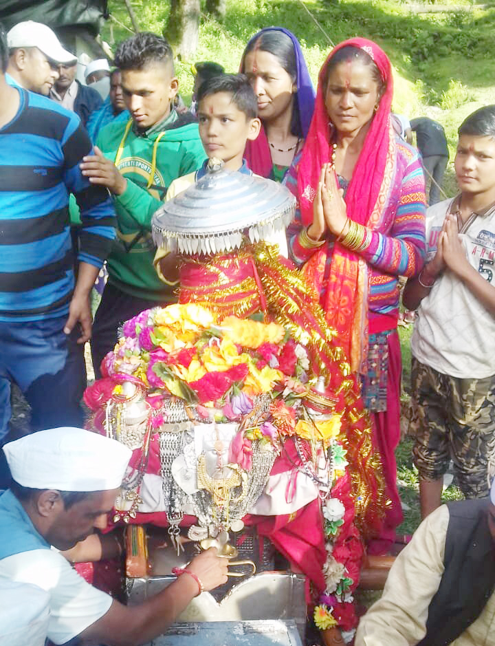 थराली। राजराजेश्वरी अपनी कैलाश यात्रा के तीसरे पड़ाव में सोमवार को जब सोल घाटी के कोलपुडी गांव पहुंची तो भक्तों मैं गजब का उत्साह था। ऐसा कतई नहीं लग रहा था कि टूटे रास्तों चट्टानों ,बहते हुए गधेरों को पार कर भक्त यहां पहुंचे हो गांव से दूर 3 किलोमीटर से ही मां के जयकारे सुनाई दे रहे थे। और लोग मां की डोली का बेसब्री से इंतजार कर रहे थे क्यों न करें उनकी आराध्य देवी एक साल बाद उनको दर्शन जो दे रही थी। जैसे ही बधाण की मां भगवती नंदा देवी राज राजेश्वरी की डोली कुलपुली गांव पहुंची भक्तों ने मां के जयकारों और ध्याणीयो ने मांगल गीत गाकर मां की आगवानी की इस दौरान गांव के पंचायती चौक में देवी के प्रश्वा अवतरित हुई और भक्तों को आशीर्वाद दिया। देवी की एक झलक पाने के लिए सुबह से ही गांव में भक्तों और धाणियो का तांता लगना शुरू हो गया था। और रात्रि तक गांव में भक्तों से खचाखच भर गया था। जैसे ही देवी की डोली पहुंची डोली के साथ चलने वाले आचार्य गौड़ ब्राह्मणों द्वारा वेद मंत्र उच्चारण से विशेष पूजा अर्चना की गई। धाणियो ने माँ नंदा को श्रृंगार सामान भेंट किया मुख्य पुजारी मंसाराम गौड़ ने भक्तों को देवी का प्रसाद वितरित किया इसके बाद गांव में रात्रि जागरण के दौरान देवी के गीतों जागरण और चांचिडियो से माहौल भक्तिमय हो गया। मंगलवार को देवी की डोली डूंगरी पहुंचेगी।