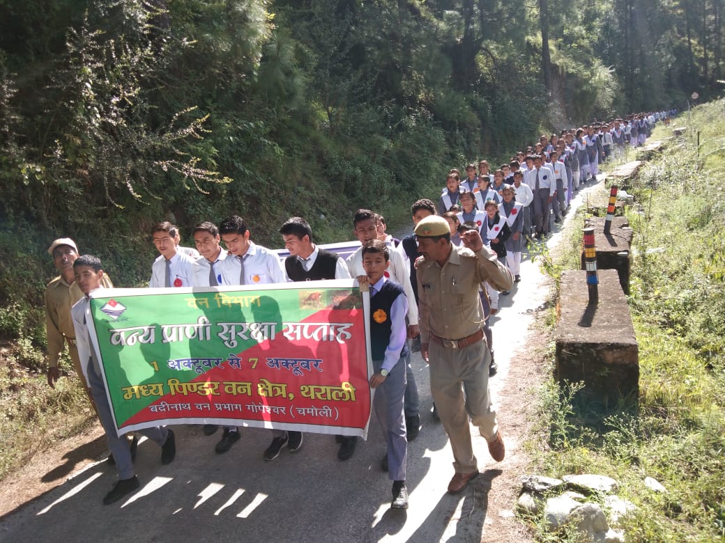 स्मृति इंटर कालेज के छात्र,छात्राओ ने कालेज परिसर से एक रैली निकाली जो की वन्य जीवो के प्रति कुरूरता छोड उनके संरक्षण के प्रति नारेबाजी करते हुए मुख्य बाजार चेपडो पहुची,यहां से वापस लौट कर कालेज के मैदान मे एक गोष्ठी मे तबदील हो गई।इस मौके पर वक्ताओ ने जंगलो मे घट रहे वन्य जीवो पर चिन्ता व्यक्त करते हुए कहां की अगर तेजी से घट रहे वन्य जीवो का संरक्षण नही किया गया तो वह दिन दूर नही जब तमाम प्रजाति के वन्य जीवो का अस्तितुव समाप्त हो जायेगा जो कि मानव जाति के लिए अच्छा नही माना जा सकता हैं। इसके लिए लोगो को वन्य जीवो के संरक्षण के लिए समय रहते कदम उठाने होगे।गोष्ठी में वन दरोगा भरत बिष्ट, हुक्कम सिंह रावत, वन आरक्षी नारायण जोशी कालेज के व्यायाम शिक्षक विपुल पंवार आदि ने विचार व्यक्त किये।