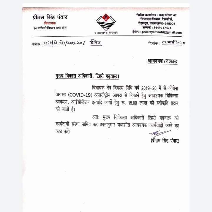 विधायक प्रीतम सिंह पंवार ने राहष कोष में दिया एक माह का वेतन।