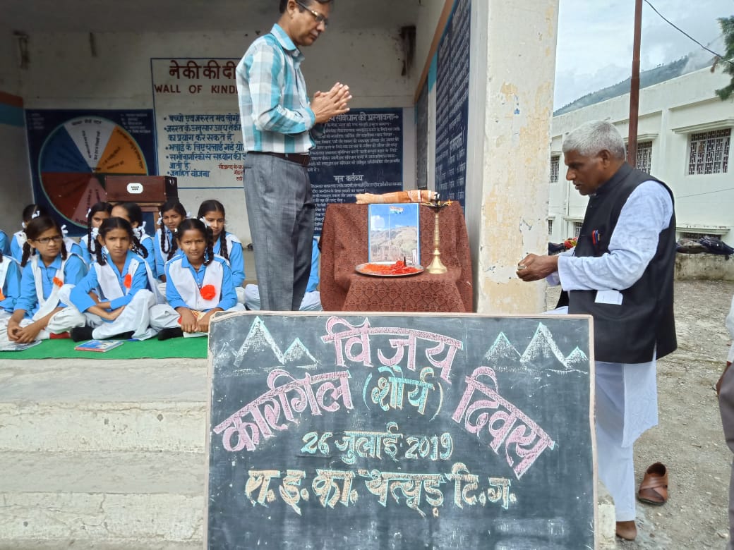 थत्यूड़। विकासखंड जौनपुर ब्लाक मुख्यालय के सरस्वती शिशु मंदिर एवं राजकीय मॉडल इंटर कॉलेज थत्यूड़ में कारगिल शौर्य दिवस पर कारगिल में शहीद हुए जांबाजों को श्रद्धा सुमन अर्पित किये। एवं सरस्वती शिशु मंदिर के छात्र-छात्राओं द्वारा कारगिल शौर्य दिवस के उपलक्ष में बाजार में एक रैली निकालकर सैनिकों के याद में सम्मान एवं राष्ट्रीयता के नारों से सम्मान किया इस अवसर राजकीय मॉडल इंटर कॉलेज के प्रधानाचार्य एसके सहगल ने बच्चों को कारगिल में शहीद हुए सैनिकों के विषय में अवगत कराते हुए वीर सैनिकों के बलिदानों से प्रेरणा लेने के लिए प्रेरित किया इस अवसर पर सरस्वती शिशु मंदिर के प्रधानाचार्य पिचपन सिंह मिश्रवाण प्रमोद राणा सोहनलाल पठोई प्रवक्ता राजेंद्र कुमार अनिल बिष्ट एसएस राणा राजीव कुमार बलवीर सिंह पवार आदि कई लोग उपस्थित थे।